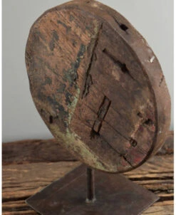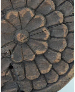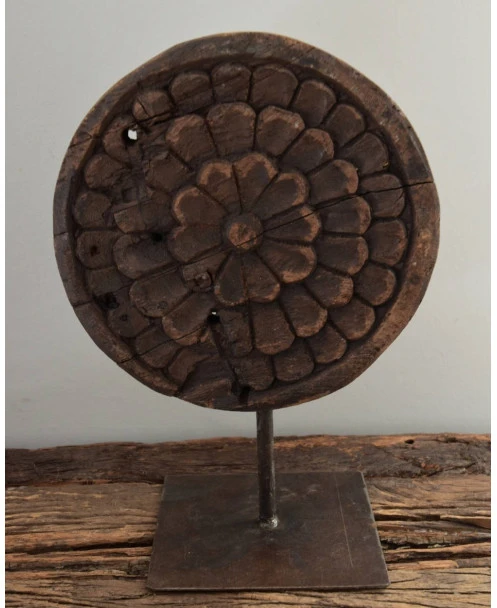 Houtsnijwerk decoratie cirkel bloem op statief. Dit prachtige unieke houtsnijwerk van een bloem is naturel van kleur en staat op een metalen statief. Het houtsnijwerk is oud en daardoor niet overal het zelfde wat veel sfeer geeft en een uniek uitstalling.
