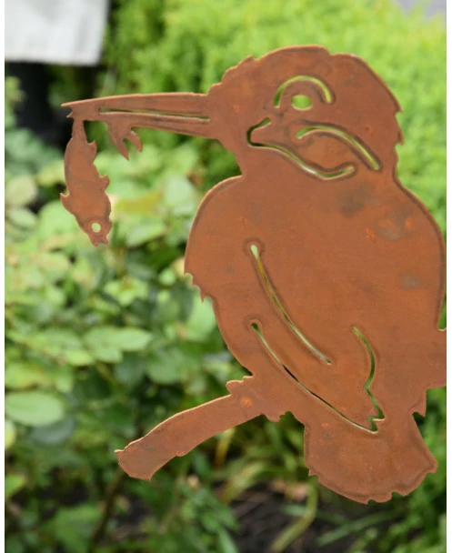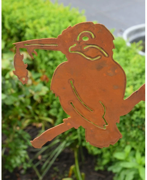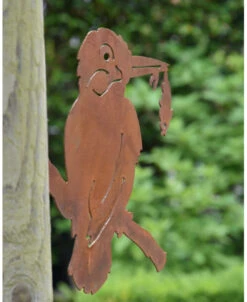 IJsvogel met visje op tak, Metalen schroefvogel. Deze leuke IJsvogel als tuin decoratie heeft een klein net gevangen visje in zijn bek en zit op een takje. De tuinvogel is van metaal gemaakt die door een speciale behandeling een mooie roestlaag heeft gekregen wat een warm en natuurlijk effect geeft. U kunt de vogel zo met de schroef aan een paal zetten bijvoorbeeld. Ook is het leuk om hem bv bij een vijver of watertje te hangen alsof hij daarin heeft gevist….