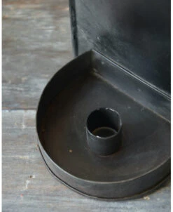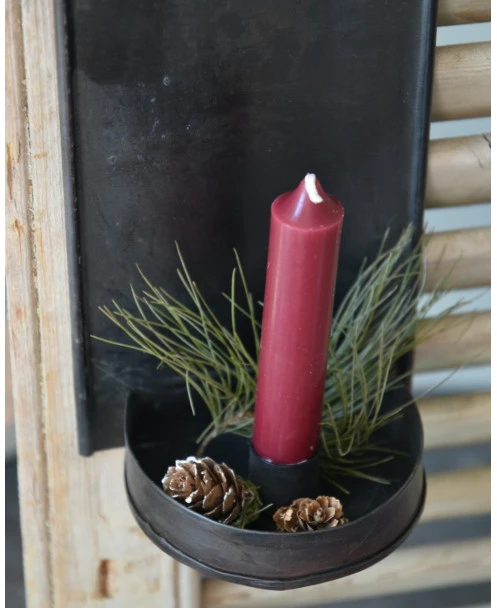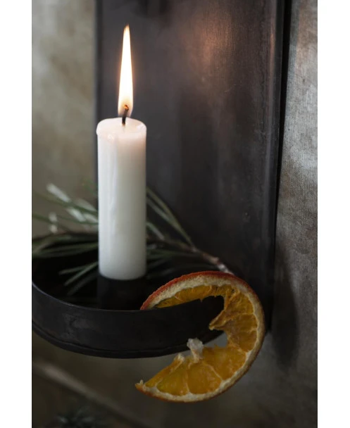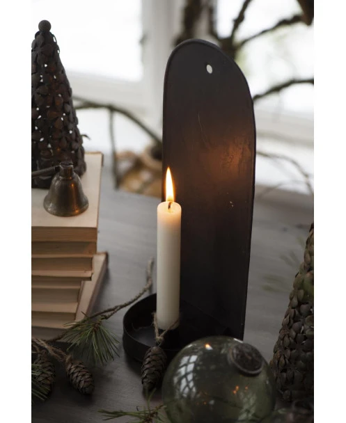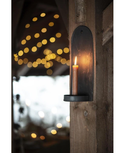 Kandelaar in rustiek voor aan de muur, IB Laursen. Deze mooie kandelaar van metaal in een donker rustiek uitvoering heeft een prachtig eenvoudig model. De hoge achterkant heeft een ronde bovenzijde met ophang oog en aan de onderkant zit het ronde plateau met hoge rand (voor druipend kaarsvet/of een gezellig takje) en de kaars inzet. In de kaarsen inzet passen de standaard tafelkaars in lange en korte uitvoeringen. Door van kleur kaars te wisselen kunt u de sfeer kiezen die bij u past.