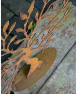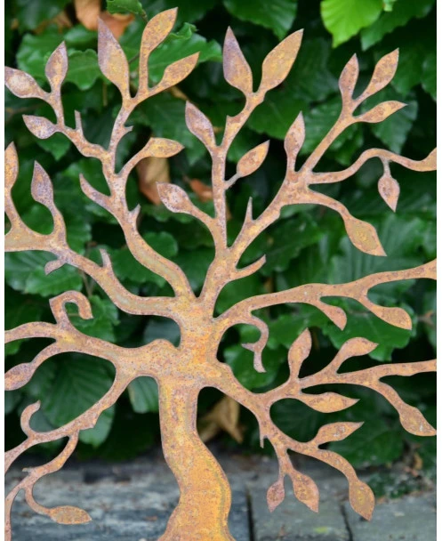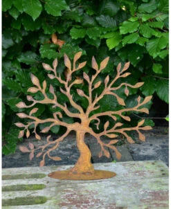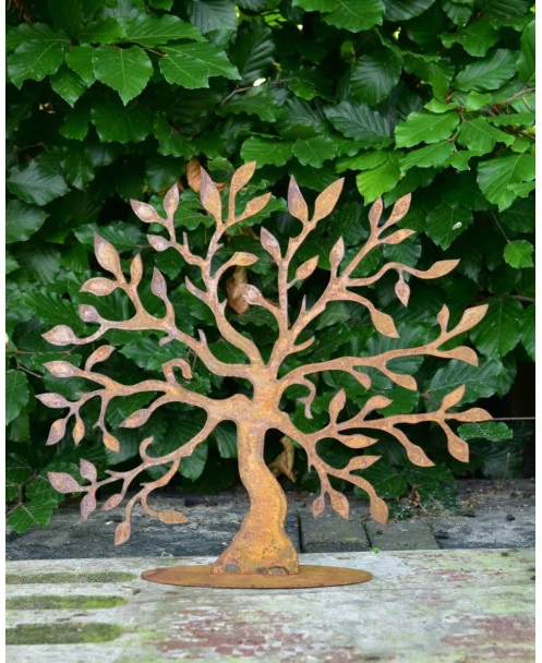 Kleine boom metaal geroest. Deze sierlijke Levensboom staat op een ovale metalen voet, de boom zelf heeft een mooie sierlijke stam met takken en bladeren. Het metaal heeft een speciale behandeling gehad zodat deze een mooie roestlaag heeft. De boom is een mooie tuindecoratie en in in twee maten verkrijgbaar.