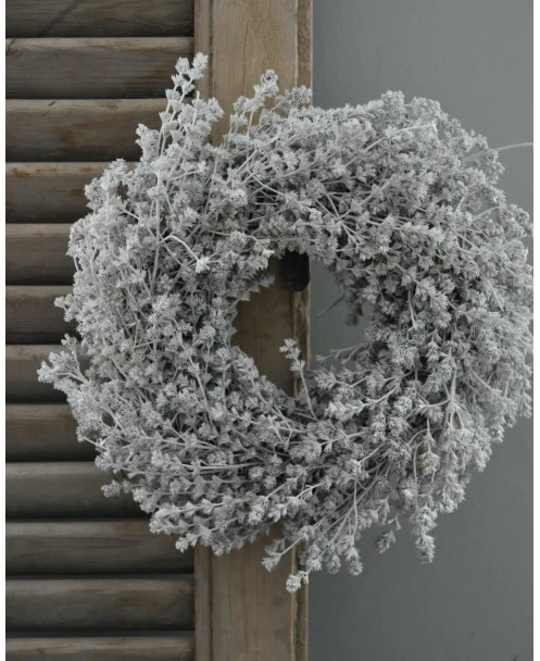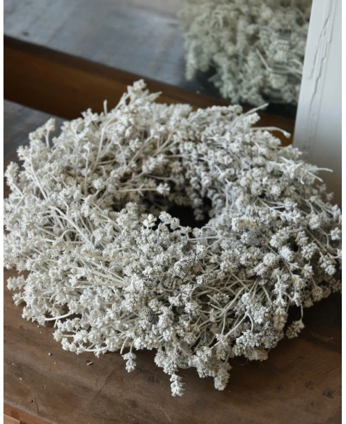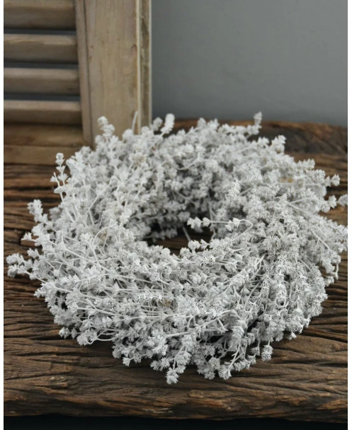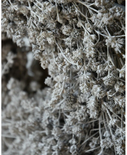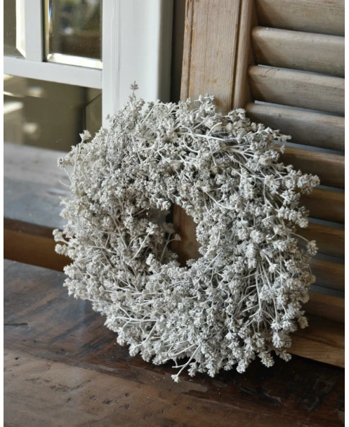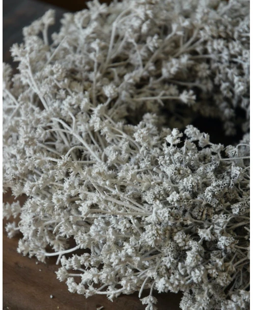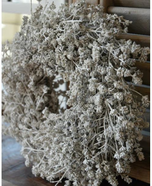 Krans van gedroogd Leinenkruid, wit per stuk. Deze leuke krans in gemaakt van gedroogd leinenkruid wat gewit is. De krans kan bv mooi op een pot worden gedecoreerd of aan de muur worden opgehangen. De krans is eenzijdig opgemaakt.