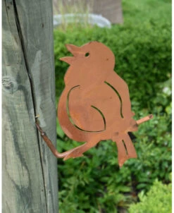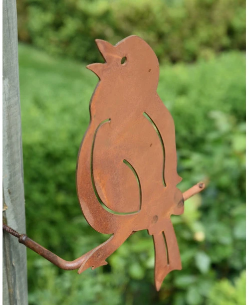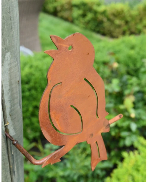 Kwetteraar tuin vogel van metaal op stok. Deze leuke tuinvogel de Kwetteraar is van roest metaal als silhouet en zit op een stokje/takje die om de hoek gaat voor een mooi 3D effect. Deze schroefvogel kunt u zo met de schroef die aan het stokje/takje zit in een boompaal, schutting of houten schuurtje vast schroeven. Het metalen vogeltje heeft een speciale behandeling gehad waardoor hij een mooie roestlaag heeft gekregen. Zo kunt u lang genieten van deze zingende Kwetteraar…