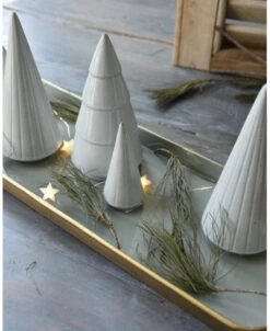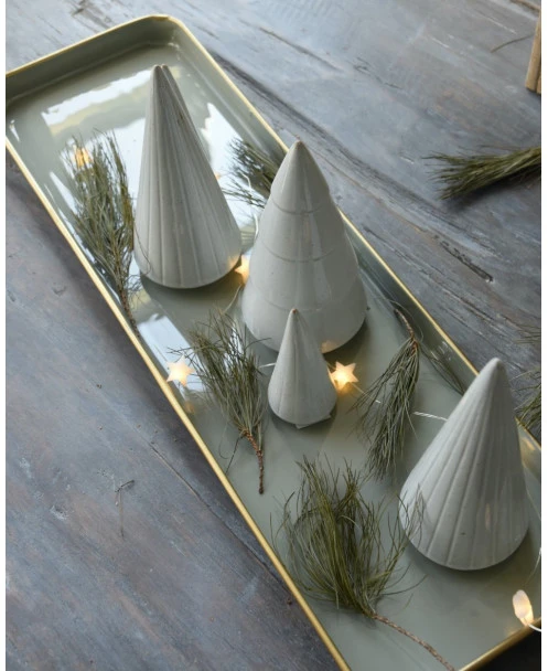 Langwerpige tray grijs van binnen en antiek gouden rand, IB Laursen. Deze rechthoekige lange tray/plateau is van metaal gemaakt en heeft een mooie glanzende grijzige/olijfblad groene binnenkant en de buitenkant is in het antiek goud. De tray heeft afgeronde hoeken en kan op veel manieren worden gedecoreerd. Zo is hij erg mooie met de klei witte boompjes zoals op de afbeelding, een asymmetrisch bloemstuk, kaarsen, een lampje en wat mooie attributen……. De tray is ook in een ronde uitvoering verkrijgbaar.