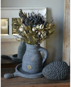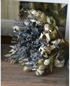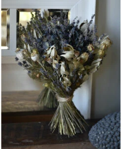 Lavendel Hortensia biedermeier droogbloemen boeket. Dit mooie compacte droogbloem boeket heeft als hart een Hortensia die gevuld is met Lavendel en omringd wordt met Juffertjes, Steeneik, Papavers en nog meer Lavendel. Het boeket is in mooie tinten grijzig groen, blauwen en naturellen. Het boeket is gebonden met touw wat ook het model behoud. U kunt de biedermeier zo op een vaas of pot zetten of neerleggen.