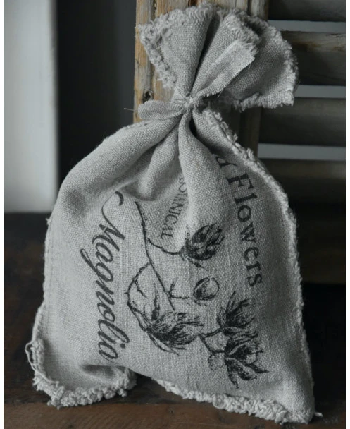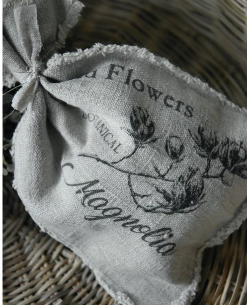 Linnen geurzakje met Magnolia takken, Shabby. Dit leuke geurzakje van linnen stof is naturel grijzig van kleur met een mooie afbeelding van een Magnolia tak (tulpenboom) erop. Het zakje is dicht geknoopt met een stukje linnen en gevuld met een luxe, mysterieuze warme geur. Het geurzakje komt uit de Shabby collectie en het linnen hiervoor is iets fijner, zodat het zakje mooi tot zijn recht komt en niet alleen lekker ruikt maar ook gelijk erg decoratief is.