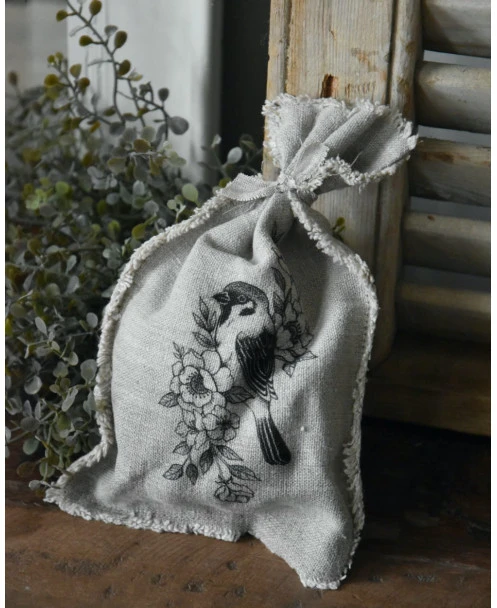 Linnen geurzakje met vogel op bloesem tak, Shabby. Dit leuke geurzakje van linnen stof is naturel grijzig van kleur met een mooie afbeelding van een vogeltje op bloesem tak erop. Het zakje is dicht geknoopt met een stukje linnen en gevuld met een luxe, mysterieuze warme geur. Het geurzakje komt uit de Shabby collectie en het linnen hiervoor is iets fijner, zodat het zakje mooi tot zijn recht komt en niet alleen lekker ruikt maar ook gelijk erg decoratief is.