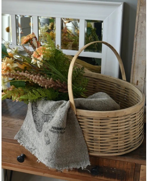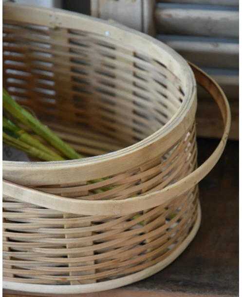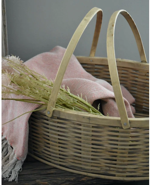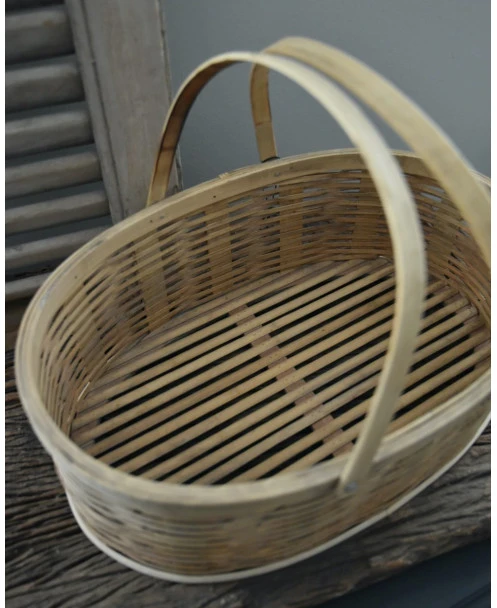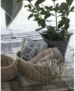 Mand met twee hendels L, IB Laursen. Deze prachtige ovale mand heeft een mooi vlechtwerk. Het vlechtwerk is van dun hout gemaakt, ook de bodem heeft een mooi patroon. Aan de mand zitten twee hengsels die in verschillende posities kunnen worden gezet. U kunt de mand leuk vullen met een kleed en bloemen bijvoorbeeld. Hij kan in iedere ruimte in huis worden gedecoreerd.