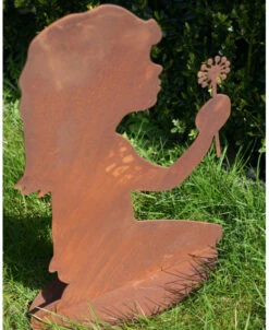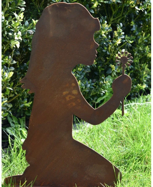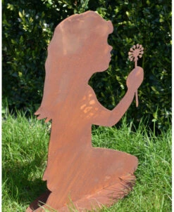 Meisje met Paardebloem ecoroest tuindecoratie. Deze leuke tuindecoratie van een meisje die tegen een paardenbloem blaast is als silhouet van ecoroest. Het meisje zit op haar knieën welke op een ovaal plaatje zit zodat u hem zo neer kunt zetten in de tuin of op het gazon bijvoorbeeld. Er is altijd wel een mooi plekje te vinden in de tuin waar dit lieve meisje mag zitten……