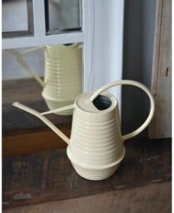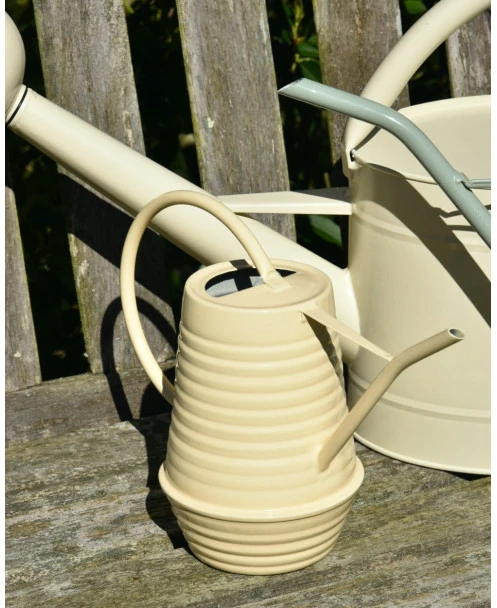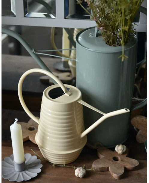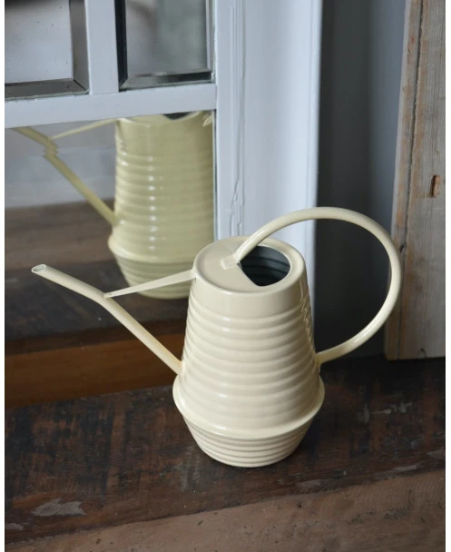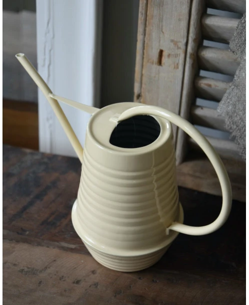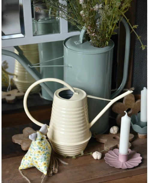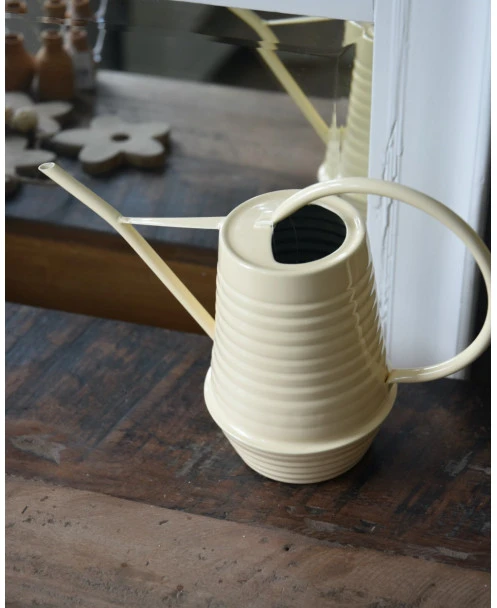 Metalen gieter in zacht geel 0.95 liter, IB laursen. Deze leuke kleine gieter is van metaal met een zacht gele kleur in een erg leuk model waar een lijnenspel in verwerkt zit. De gieter heeft een smal groot handvat en een smalle water tuit. U kunt de gieter ook gemakkelijk binnen gebruiken voor de kamerplanten. Ook is het leuk om er wat bloementakken in te zetten bijvoorbeeld. Tip, laat nadat u de planten water gegeven heeft geen water in de gieter staan, zo voorkomt u roest, algen-groei en bacterie-groei.