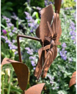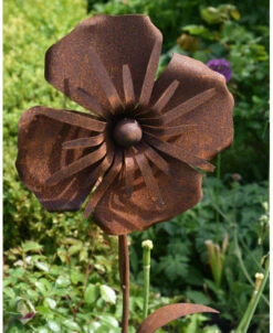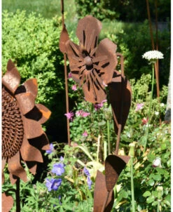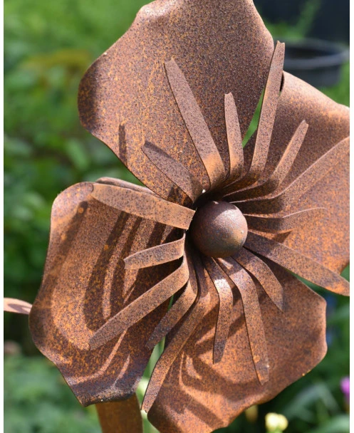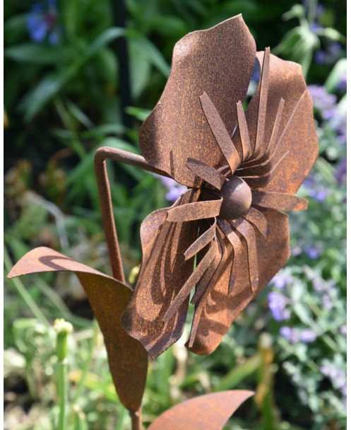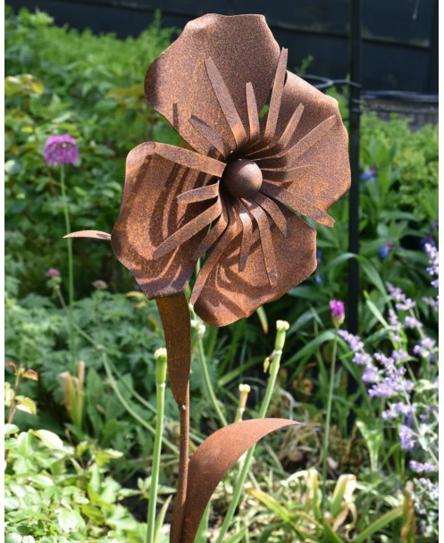 Metalen tuinsteker roestbloem Anemoon. Deze prachtige grote bloem tuinsteker in Anemoon model is in 3D met een bloemblaadjes, stamper en meeldraden op een steel met bladeren. De Tuinprikker kan zo in de grond geprikt worden zodat u het hele jaar kan genieten van deze prachtige bloem die door zijn metalen roest uiterlijk mooi opgaat in de omgeving en ieder seizoen door alle kleuren en veranderingen in de tuin een ander geheel bied.
