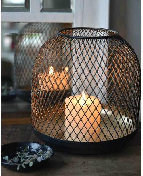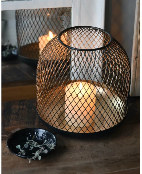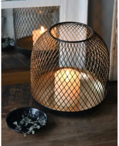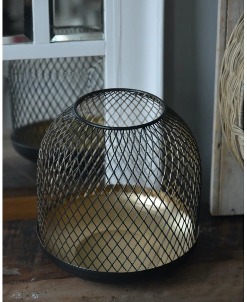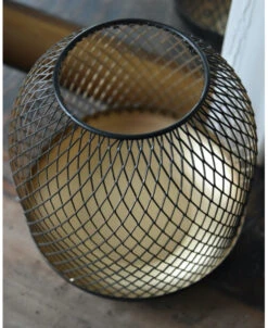 Metalen windlicht met ruit-effect zwart met goud kleurig binnenwerk. Dit mooie windlicht is van metaal gemaakt met een stevig gaas-ruit-effect in het zwart met een soort antiek-look gouden binnenkant. Door deze binnenkant ontstaat er een warme gloed wanneer er een kaars in gebrand wordt. Het windlicht past in veel verschillende woonstijlen. Er zit geen windglas in dit metalen windlicht.