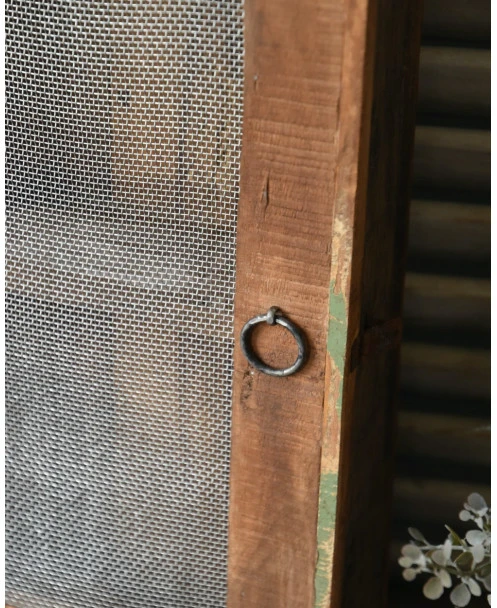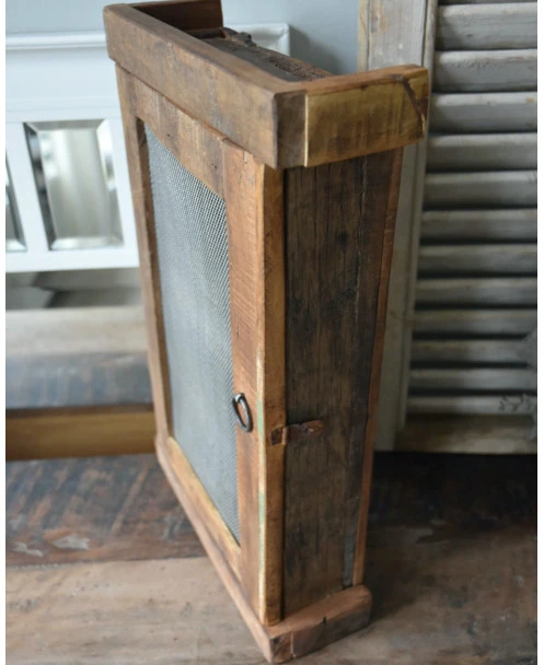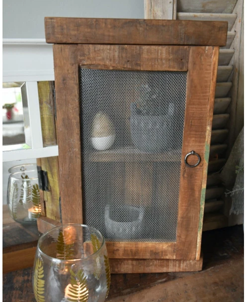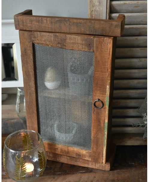Oud houten ‘kaas’ kastje met gaas deur unique, IB Laursen. Dit mooie ‘kaas’ kastje van oud gerecycled hout heeft een deur met gaas erin en een opleg plank. Het kastje komt uit de Unique collectie van IB Laursen en is ook uniek doordat het hout gerecycled is en vol karakter. Ieder item heeft zo zijn eigen kenmerken. Het kastje is vrij zwaar, de deur met gaas heeft een oog als knop en naar de zijkant zit een slotje om hem dicht te houden. In de kast zit een legplank en aan de achterzijde zitten twee ophang ogen waarmee het kastje eventueel kan worden opgehangen. Ook is het hel geschikt om hem zo neer te zetten op de aanrecht of een niet al te hoge kast tegen de muur bijvoorbeeld.