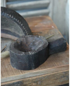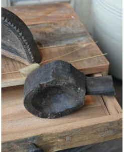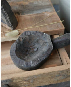 Oude houten keuken vijzel/schep, IB Laursen. Deze houten keukenhulp is oud en ziet er geleefd uit. De kleine vijzel of schep is van hout die inmiddels een donkere kleur heeft, de onderkant is redelijk vlak, er zit een oor aan, een rand waar nog wat decoratieve houtsneden in zitten en hij is iets hol. Of dit attribuut als minivijzel of als schep of misschien wel voor iets heel anders is gebruikt…..? U kunt hem nu in ieder geval als decoratie gebruiken in een mooie glazen pot, of mand of op een mooie plank in de keuken….