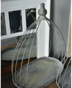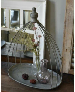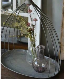 Ovaal zink grijs plateau met sierlijk gebogen toog, groot. Dit elegante plateau van metaal heeft een sierlijk gebogen. toog van dik draad met bovenop een mooi afgewerkte knop. Het plateau is ovaal van vorm en de toog zet zich op vanuit de buitenkant om zo een mooi effect te creëren. U kunt dit plateau decoreren naar lust met bijvoorbeeld leuke vaasjes, groen en gedroogde kegels, of op de aanrecht met wat olijfolie, de zoutmolen en kruiden….