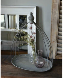 Ovaal zink grijs plateau met sierlijk gebogen toog, groot. Dit elegante plateau van metaal heeft een sierlijk gebogen. toog van dik draad met bovenop een mooi afgewerkte knop. Het plateau is ovaal van vorm en de toog zet zich op vanuit de buitenkant om zo een mooi effect te creëren. U kunt dit plateau decoreren naar lust met bijvoorbeeld leuke vaasjes, groen en gedroogde kegels, of op de aanrecht met wat olijfolie, de zoutmolen en kruiden….
