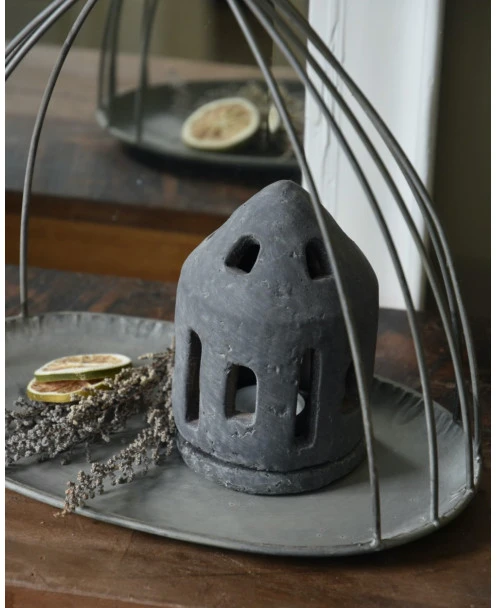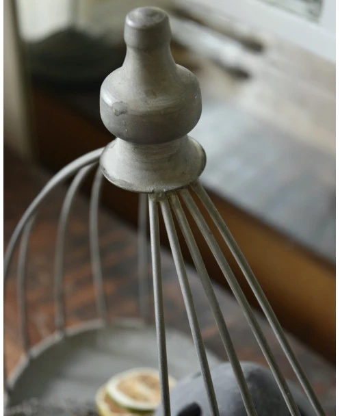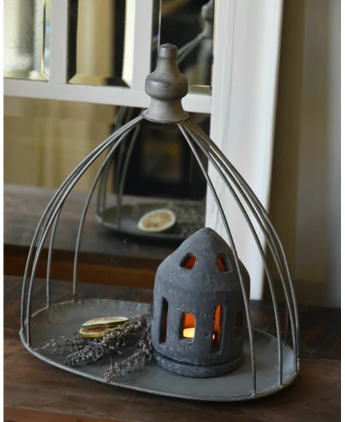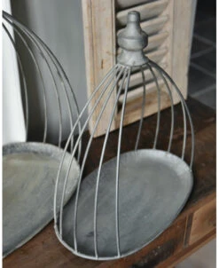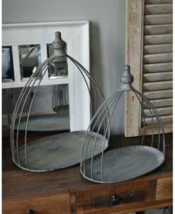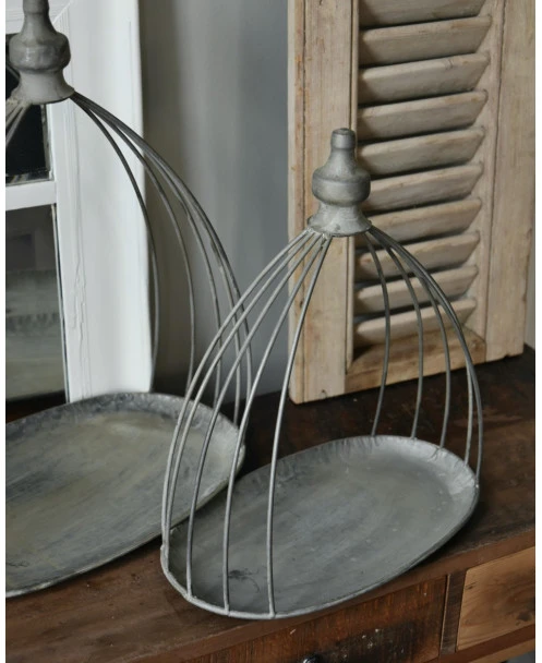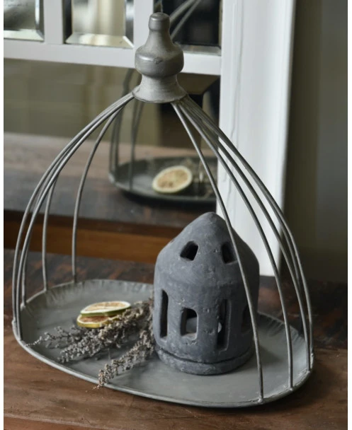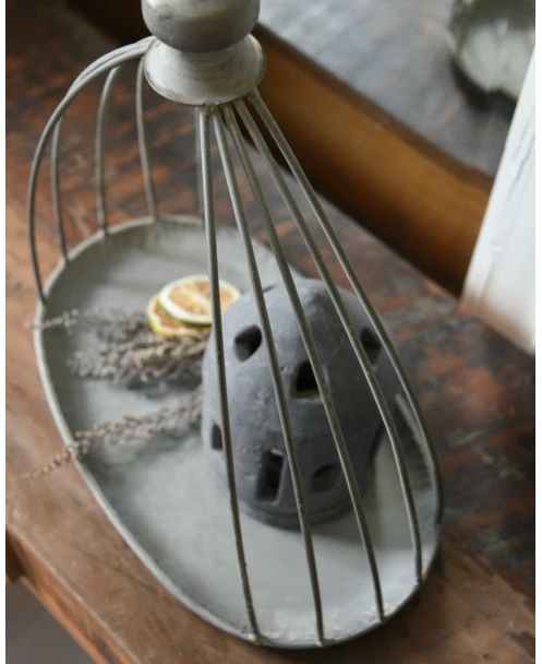 Ovaal zink grijs plateau met sierlijk gebogen toog, klein. Dit elegante plateau van metaal heeft een sierlijk gebogen. toog van dik draad met bovenop een mooi afgewerkte knop. Het plateau is ovaal van vorm en de toog zet zich op vanuit de buitenkant om zo een mooi effect te creëren. U kunt dit plateau decoreren naar lust met bijvoorbeeld leuke vaasjes, groen en gedroogde kegels, of op de aanrecht met wat olijfolie, de zoutmolen en kruiden….