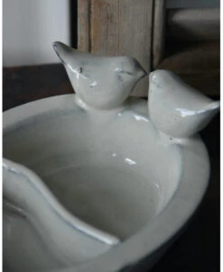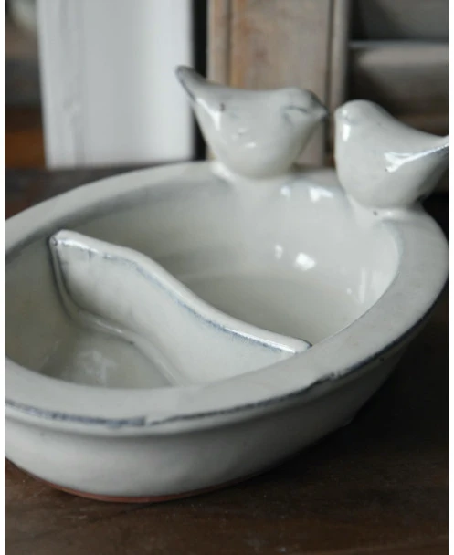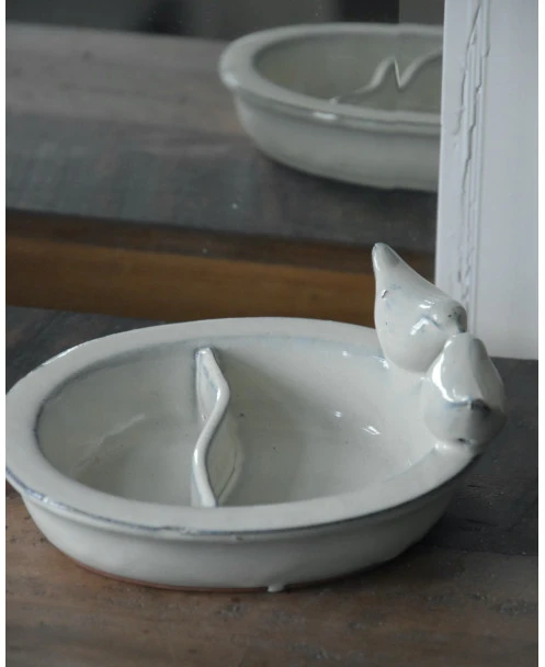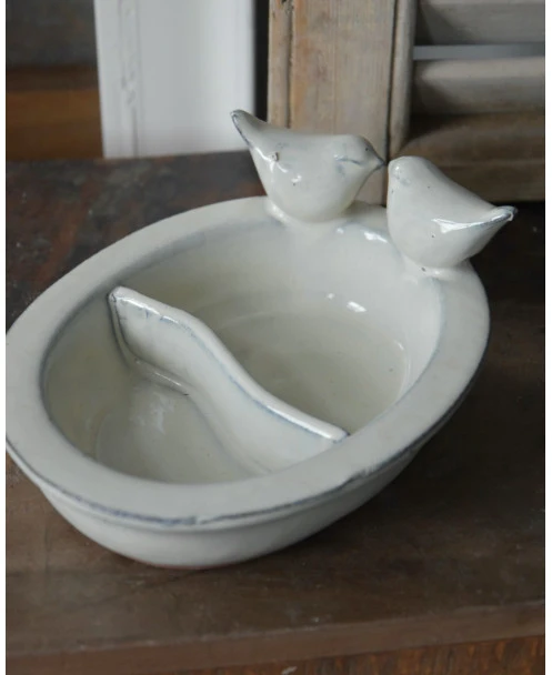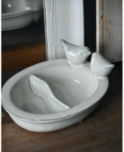Ovalen vogel voeder/drink schaal met twee vogeltjes. Deze leuke schaal van room kleurig keramiek is ovaal en heeft twee vogeltjes op de rand en de schaal heeft een tussenschot, zodat er twee gedeelten ontstaan. U kunt de schaal als vogel drinkbak in de tuin gebruiken of met los voer (zet hem dan met regen overdekt neer zodat het niet nat wordt).