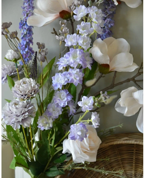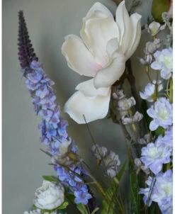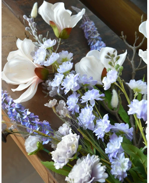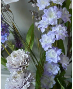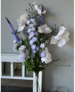 Pluk boeket zijde in zacht violet en poeder roze/wit. Dit plukboeket van zijde/kunst bloemen in mooie zachte tinten is eenzijdig opgemaakt. Het boeket is gemaakt met o.a. Magnolia, Veronica, Delphinium, dubbele Zinnia’s, een roos en fijne violet kleurige bloemetjes met groen. De prachtige zachte tinten violet passen heel mooi bij de bijna witte bloemen die iets poeder roze over zich hebben. Het boeket kan op een mooie flesvaas worden gezet bijvoorbeeld. U kunt uiteraard het boeket met een tangetje op de juiste lengte knippen of buigen, Het kan zijn dat wij de onderkant van de stelen buigen voor vervoer.