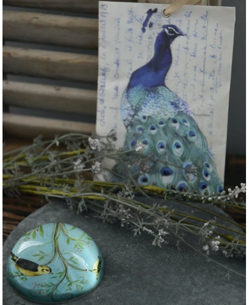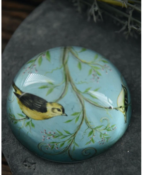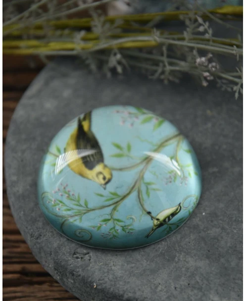 Presse papier met vogels op tak in pastel blauw per stuk. Deze prachtige brocante halve glazen bol heeft een mooie pastel kleurige afbeelding van vogels in een tak. De zware decoratieve bol kan heel goed worden gebruikt om papier bv op zijn plek te houden, maar staat ook prachtig op een bijzettafeltje of in de boekenkast.
