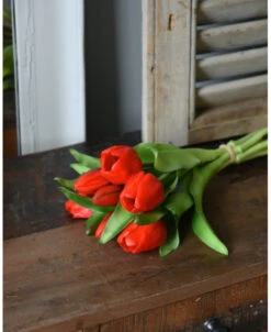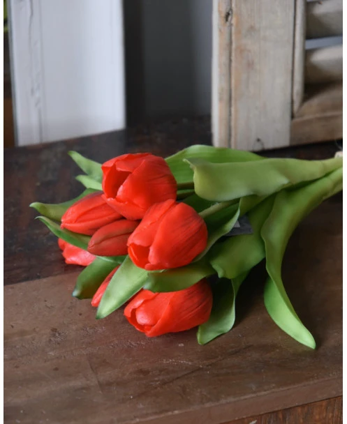 Real touch Hollandse Vermeer tulpen gemĂȘleerd rood, bos 7 stuks. Deze prachtige Hollandse Vermeer tulpen die zich typeren door een extra grote bloem kop hebben een mooie iets gemĂȘleerde tint rood. De real touch tulpen zijn zijde/kunst en kunnen zo in een mooie pot of vaas worden gezet. In een bos zitten 7 bloemen die in verschillende stadia van boei zijn. U kunt de tulpen ook eventueel mengen met ander kleuren om zo een voor u perfecte bos te creĂ«ren en er daarna heel lang van genieten.Â