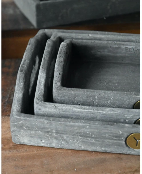 Rechthoekige tray met handvaten middel, Vintage Brynxz. Deze mooie tray in dienblad model is van zwaar aardewerk en heeft een vintage grijze afwerking. De tray heeft twee handvaten en aan de voorzijde zit het Brynxz logo in de rand verwerkt. De tray is plat met rechtopstaande randen zodat u er gemakkelijk alle kanten mee op kan en hem gezellig kunt opmaken met wat mooie potjes, kaarsen en kleine decoraties bijvoorbeeld. Het blad is (zolang de voorraad strekt) in 3 maten verkrijgbaar waarvan deze het middelste formaat is.