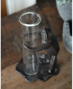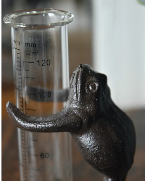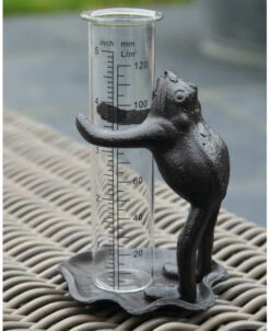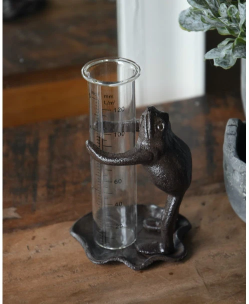Regenmeter kikker op lelieblad die de glazen meter vasthoud. Deze leuke kikker die de glazen regenmeter vasthoud in van gietijzer gemaakt. De kikker staat op een lelieblad en houd met zijn poten de glazen regenmeter vast. De glazen meter staat los in de kikkers armen zodat u hem gemakkelijk kunt aflezen en legen. Doordat de kikker van gietijzer is is het frame vrij zwaar en blijft daardoor iets gemakkelijker staan buiten.