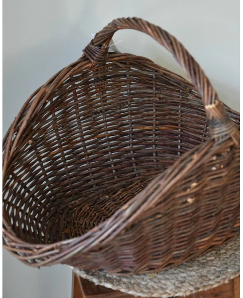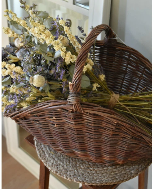 Rieten bloemen mand met hengsel, IB Laursen. Deze rieten bloemenmand heeft een elegant model met een hengsel aan de bovenkant. De mand is iets ovaal van model met hoge zijkanten, ideaal voor bv zijde of droogbloemen, of als groente/fruitmand bv.