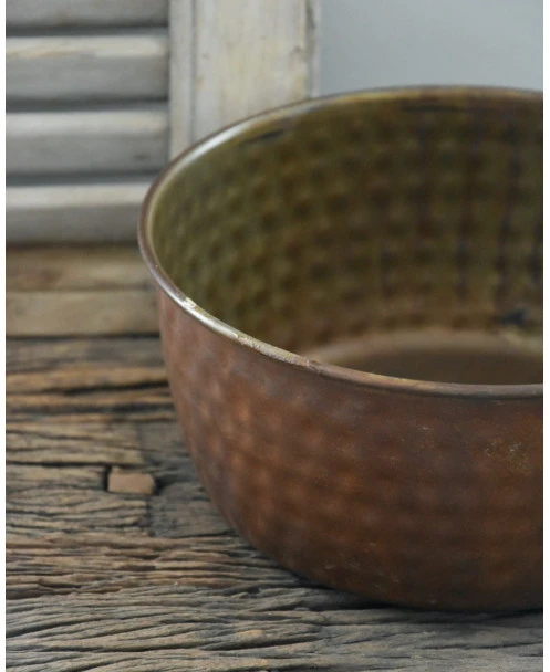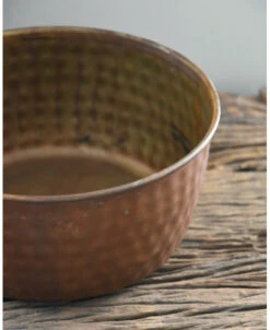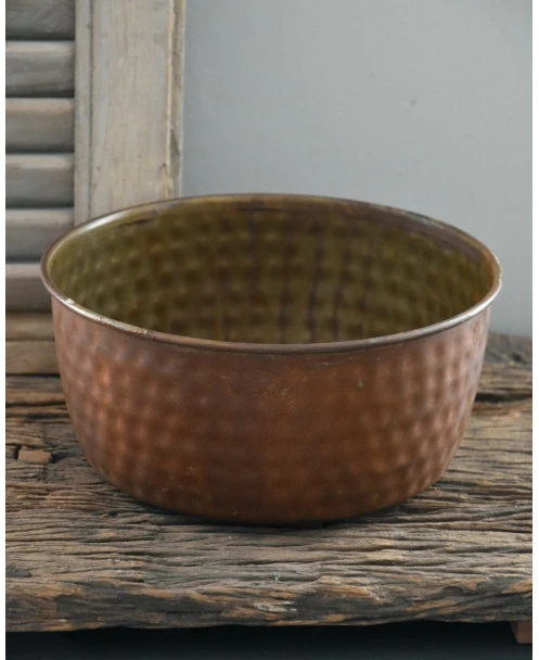 Rond metalen schaal met ‘bobbel’ structuur, groot per stuk. Deze prachtige schaal heeft een mooie verouderde look, door de afwerking en het gebruik van een (roest) buitenkant en een verouderde vage goud tint aan de binnenkant. De schaal heeft een mooie ‘bobbel’ structuur van rondingen over de gehele rand van de schaal die hoog naar boven loopt.