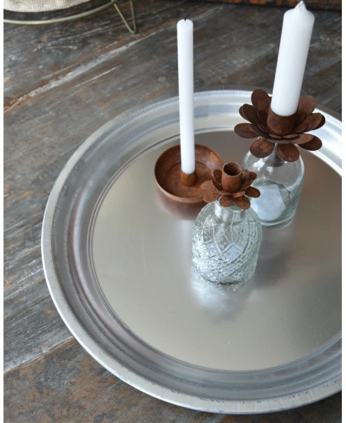 Deze zinken schaal heeft een iets blinkend zilverachtig uiterlijk met heeft een platte bodem en een opgebouwde rand. Hij kan makkelijk worden gecombineerd en is ook heel geschikt om een mooi creatief stuk op te maken, een goede ondergrond voor een gezellige workshop. Ook is deze schaal leuk om vol te zetten met kaarsen en wat decoraties als schelpen of gedroogde vruchten. Het bord heeft een veeg achtige strepen, dit hoort bij het product.