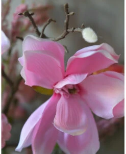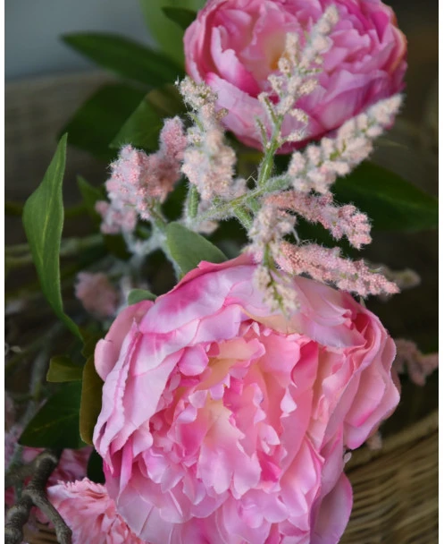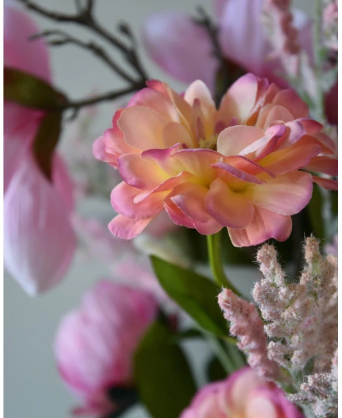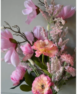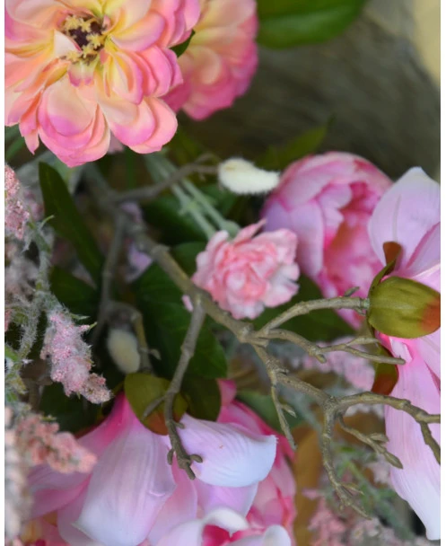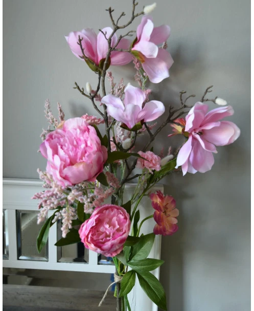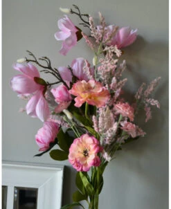 Roze plukboeket met Magnolia en Pioenrozen. Dit prachtige plukboeket is met zijde/kunst bloemen samengesteld. Het boeket met mooie voorjaarsbloeiers en wat zomerbloeiers is in het roze met een ton sur ton effect. Het boeket bestaat uit een Magnolia tak, Pioenrozen, Astilbe, Zinnia’s en Anjes. U kunt het boeket op een mooie vaas of smalle hoge pot/kan zetten bijvoorbeeld. De maximale lengte van dit boeket is 90 cm uiteraard kan dit worden ingekort met een tang. Het kan zijn dat wij de onderkant van de stelen ombuigen voor het vervoer. U kunt zijde bloemen het beste niet in direct zonlicht zetten.