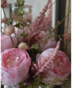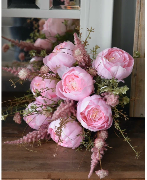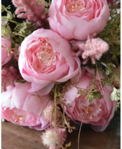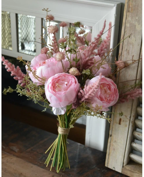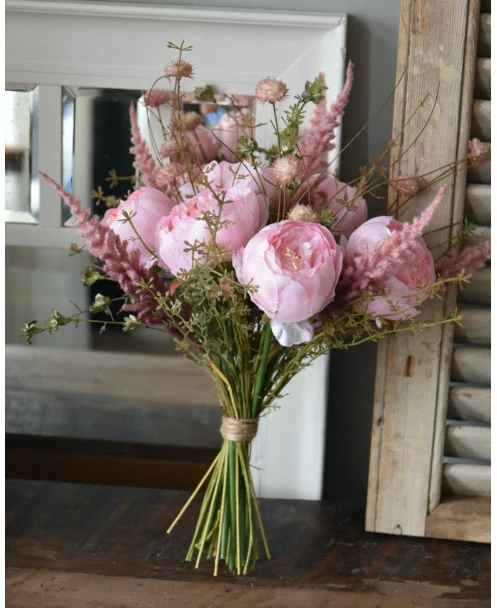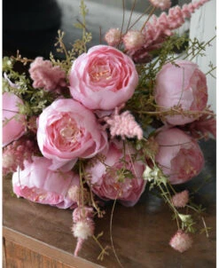 Roze zijde bloemen biedermeier boeket met Pioenrozen. Dit mooie biedermeier boeket van zijde/kunst bloemen is met gemengde roze bloemen korenschoof gebonden. Het boeket met Pioenrozen in de hoofdrol is verder opgemaakt met Astilbe, roze bolletjes en verschillende groen soortjes. U kunt het boeket zo op een mooie vaas of pot zetten en er heel lang van genieten. Het is uiteraard ook een erg mooi cadeau.