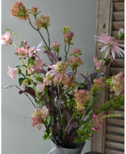 Roze zijde pluk boeket gemengd, Brynxz. Dit prachtige pluk boeket van zijde/kunst bloemen is in verschillende roze harmoniërende tinten. Het lange boeket heeft bloesemtakken en verschillende soorten bloeiende bloemen uit de collectie van Brynxz. In het boeket zitten Bouvardia bloesem, Campanula/Klokjes bloemen, Rode Eucalyptus, Echinacea en Spirea. U kunt boeket zo op een hoge vaas, kan of kruik zetten en genieten van de mooie kleuren.
