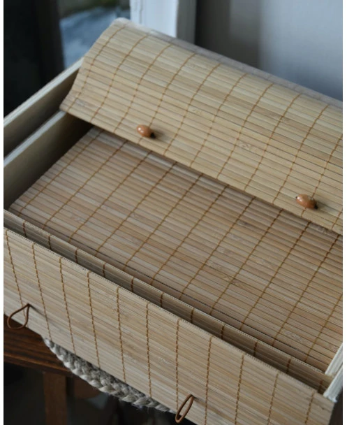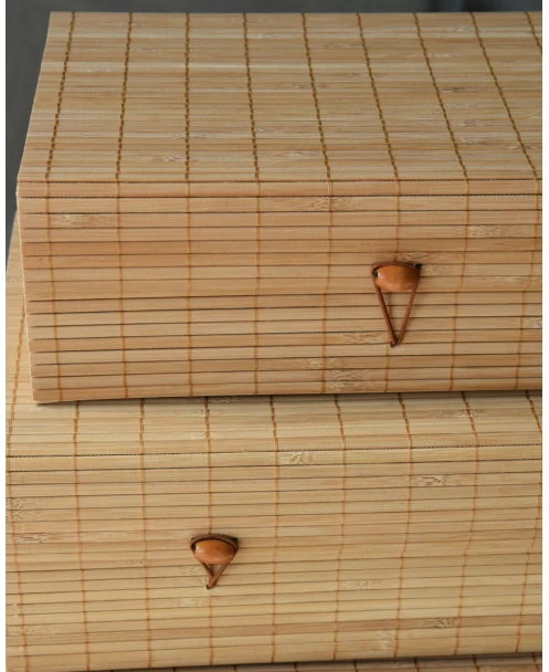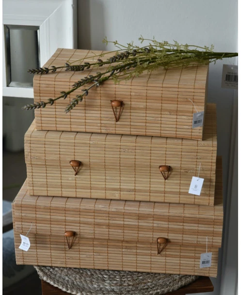 Set bamboe opberg kistjes met houten knop sluiting van 3, IB Laursen. Deze leuke opbergers zijn van bamboe hout gemaakt die als fijne latjes met draad aan elkaar zijn vastgemaakt . Aan de voorzijde zit een houten knoop waarmee het kistje kan worden gesloten. De kistjes zijn in drie oplopende maten die ook eventueel in elkaar passen. Doordat het een natuurproduct wat met de hand in elkaar gezet is kunnen er kleine afwijkingen zijn en de tinten kunnen iets verschillen als in de afbeelding. De kleinste maat heeft 1 knoop als sluiting en de twee grotere maten hebben twee knopen als sluiting. Het deksel is flexibel en valt een stukje over de voorkant heen wat een mooi effect geeft. U kunt ze als decoratie gebruiken op een kast bv of vullen met sjaaltjes, make-up en beauty producten… of in de keuken/woonkamer met……