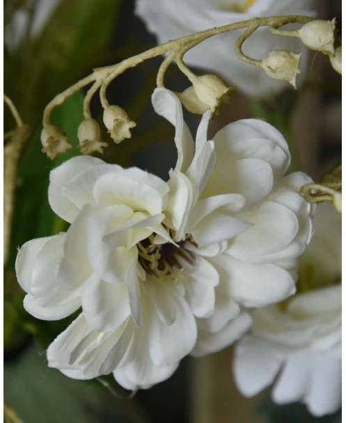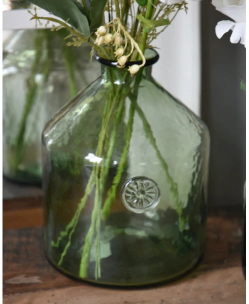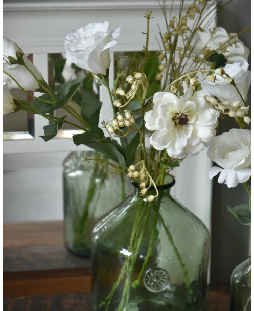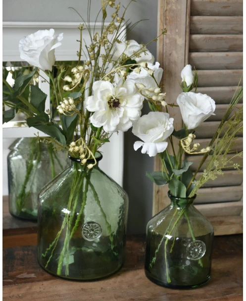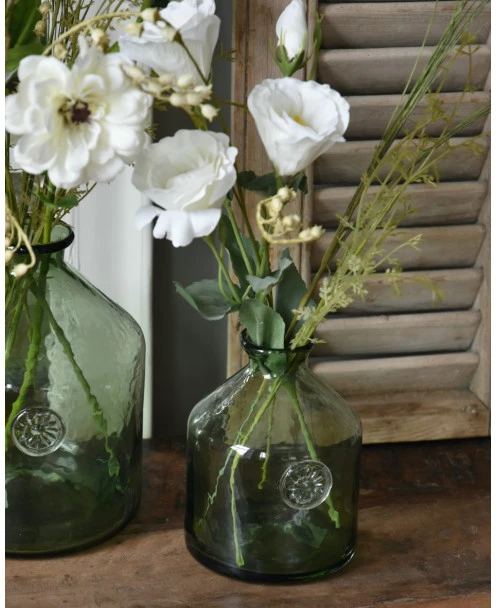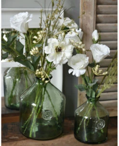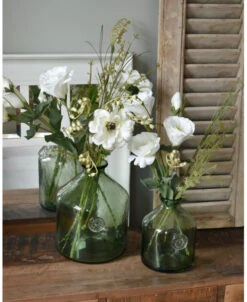 Set groene vazen met zijde bloemen. Deze leuke set met handgemaakte groene vazen met een glazen embleem aan de voorzijde zijn gevuld met zijde/kunst bloemen in het wit en groen. U kunt het set zo een mooi plekje geven in uw woning, op de tafel, het dressoir, wat lagere kast…… De vazen zijn van het Deense merk IB Laursen, zijn handgemaakt, hebben een mooie vorm en een transparant glazen embleem aan de voorzijde zoals een apothekersfles. De zijde/kunst bloemen zijn in de tinten wit groen die goed in het geheel passen. De vazen in twee maten zijn opgemaakt met Zinnia’s Lelietje Der Dalen, Lisianthus en verschillende groenen.