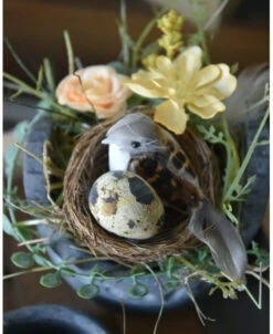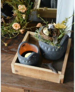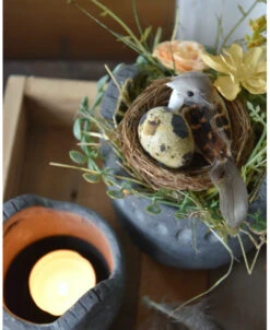 Set van houten bakje, waxinelicht potje en bloemstukje met vogeltje. Dit leuke complete set bestaat uit een houten vierkanten bak van IB Laursen, een waxinelicht potje met gewerkte rand van Brynxz en een bloemstukje in iets grotere pot met dezelfde gewerkte rand van Brynxz waar een nestje met vogel en ei in zit, wat zijde/kunst bloemen en groen, veertjes… Het geheel kan zo gezellig op de salontafel bijvoorbeeld worden gezet en is in lente sferen.