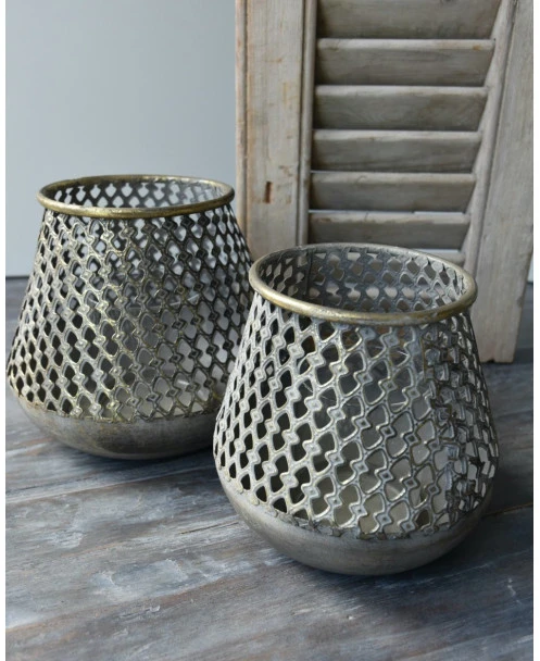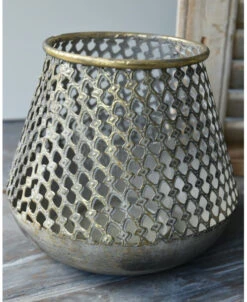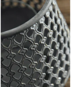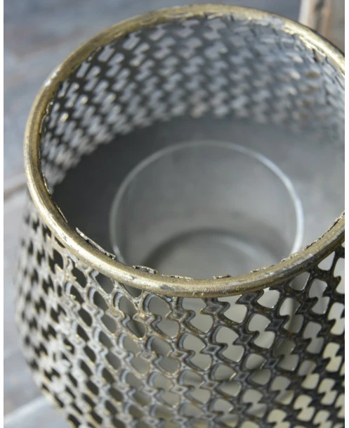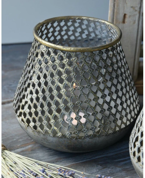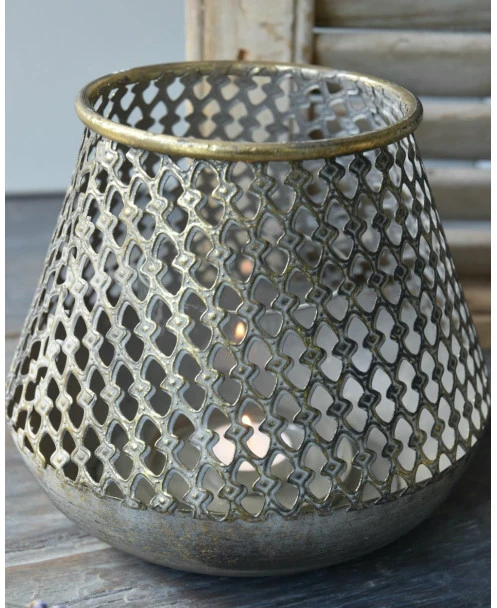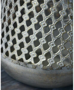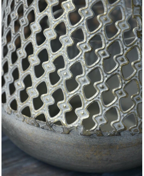 Sfeervol windlicht met mooi gaatjes patroon. Dit metalen windlicht heeft een bolvorm aan de onderzijde vandaar komt het mooie gaatjes patroon, wat een mooi en sfeervol lichtpatroon geeft. Het windlicht is grijs van kleur met subtiele goudaccenten. Aan de binnenzijde is een cilindervormig glas geplaatst om de kaars in te branden.