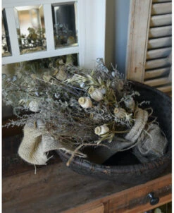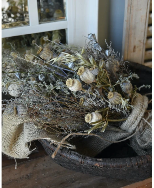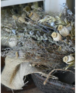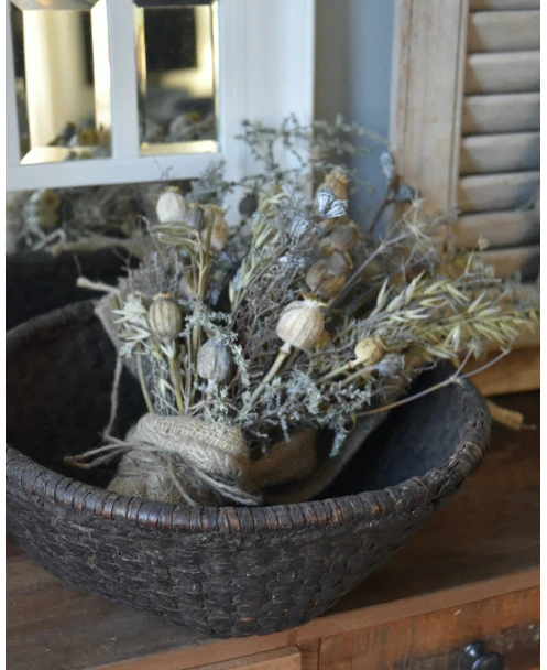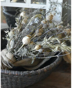 Sobere droogbloem toef in oude leemmand. Deze prachtige oude leemmand compleet met een sobere droogbloemen toef in sobere woonstijl, kunt u zo neerzetten. De toef is opgemaakt met Wilde Asparagus, Papavers, Stoebe, Tijm, Haver, Disteltjes en Eucalyptus vruchten en afgewerkt met een grove jute lap. U kunt de mand op een mooi plekje op tafel of een lage kast zetten bijvoorbeeld. De prachtige leemmand is echt oud en laat dit in kleine gebreken zien waardoor het geheel vol karakter is.