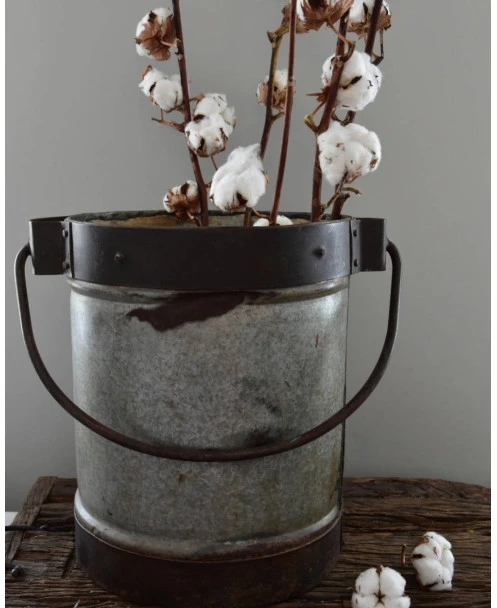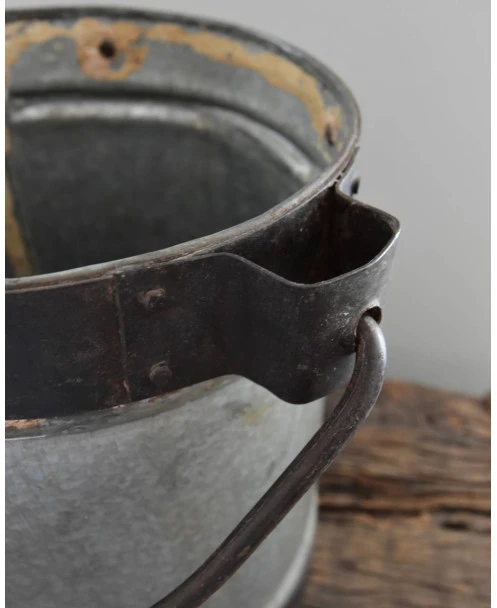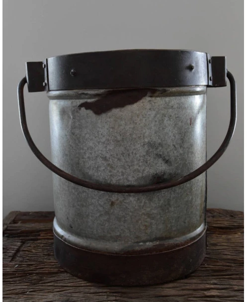 Stoere vintage emmer met hengsel, en unieke details. Zware kwaliteit met mooie veroudering als deukjes en verfspatten. Een prachtige aanwinst voor uw interieur. De emmer is zwaar en staat mooi met een olijfboompje of citrusboompje, of met wat takken bijvoorbeeld. Ook leuk om met de kerst een kleine kerstboom in te zetten.