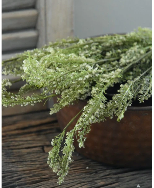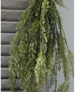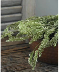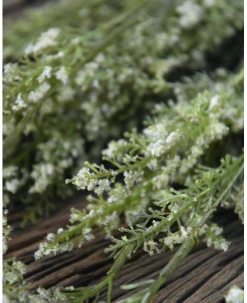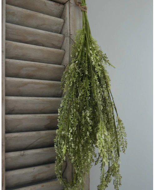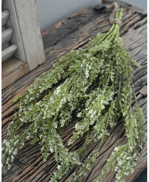 Toef groen met fijne witte bloemetjes per bos. Deze leuke ‘kunst’ toef van kruidachtig groen met wat fijne witte bloemetjes is opgebonden met een touw. De toef kan mooi worden opgehangen aan een rek bv in de keuken of worden gedecoreerd in of op een pot, aan een leuk….. Een mooie aanvulling die sfeer geeft aan uw interieur.