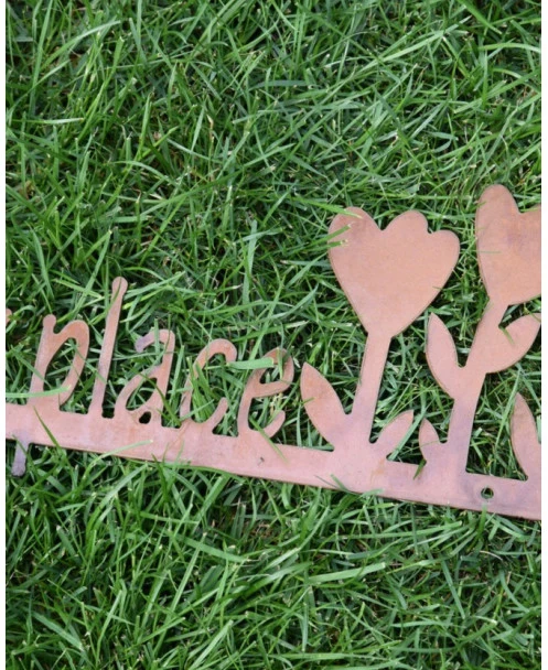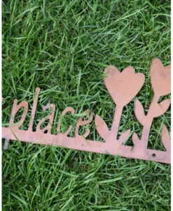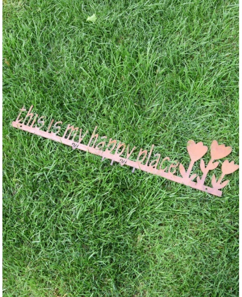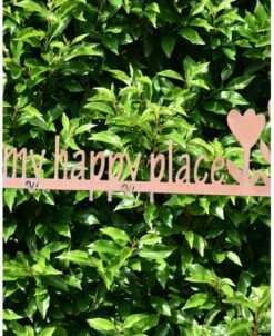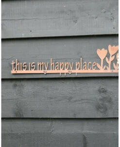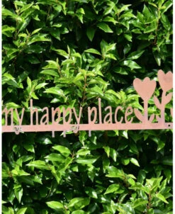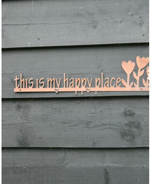 Tuindecoratie wandtekst ‘This is my happy place’ met bloemen. Dit leuke bord van ecoroest heeft een uitgesneden tekts ‘This is my happy place met daarachter drie bloemen. U kunt het bord zo aan de schutting of het schuurtje bv hangen die zo uw heerlijke tuin opfleurt. Het ecoroest is een metaal die door een speciale behandeling een mooie roestlaag heeft gekregen en zo een warm geheel vormt.