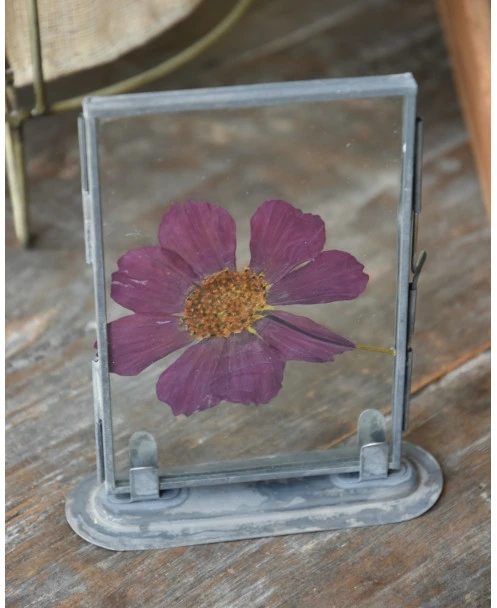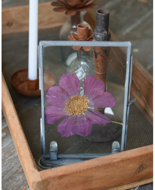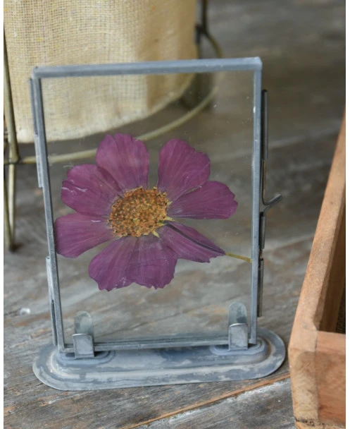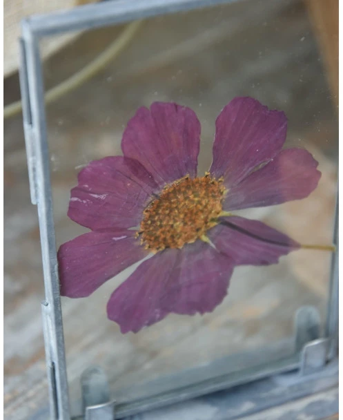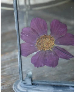 Violet kleurige geperste bloem in lijstje per stuk. Dit leuke lijstje is gevuld met een grote geperste bloem in een violet kleur. Het lijstje is van glas met een metalen frame en voet. U kunt de lijstje leuk combineren.
