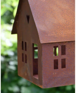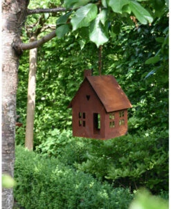 Vogel voeder huisje van roest metaal aan ketting. Dit leuke huis van metaal hangt aan een ketting met haak om op te hangen, het huis heeft ramen een dak, schoorsteen en een hartje in de top. Aan de achterzijde zit een ruim gat waar de vogeltjes gemakkelijk in kunnen om zo het ‘strooivoer’ wat in het huisje ligt gezellig op te eten met voor de vogels uitzicht door de open ramen….