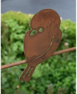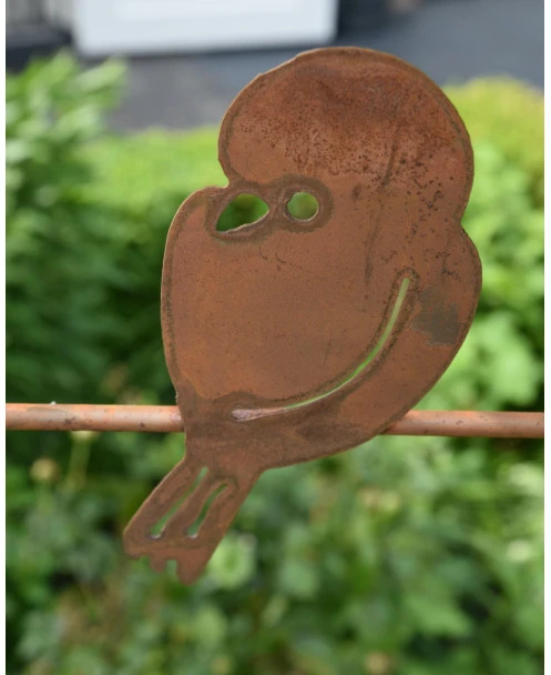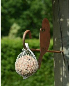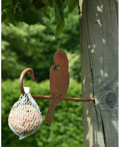 Vogel voederhaak van metaal met Musje. Dit leuke Musje zit op een (voeder) haak en is van metaal die door een speciale behandeling een mooie roestlaag heeft gekregen/. U kunt aan de krul van de haak/pin eventueel een vetbol hangen om de vogeltjes meet te voeren. Aan het uiteinde van de pin/haak zit een schroef die u in een boompaal, schutting of houten schuurtje kunt draaien (voorboren is fijn).