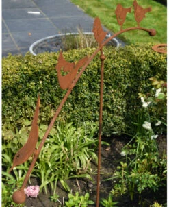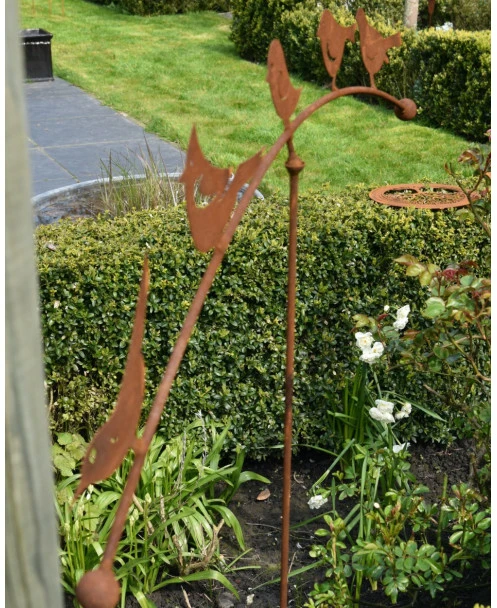 Vogelwip tuin prikker van ecoroest met 5 vogeltjes. Deze leuke Vogelwip heeft een boog met daarop 5 verschillende vogeltjes van ecoroest. De wip staat met een prikker in de grond waarop in de kom de kogel van de wip past die zo op de wind zachtjes heen en weer schommelt. De uiteinden van de wip hebben een ronde kogel en al de vogels kijken dezelfde kant op. Deze leuke tuindecoratie past in bijna iedere tuin en geeft het gehele jaar gezelligheid.