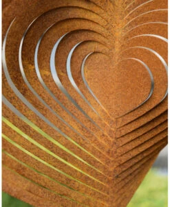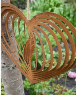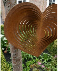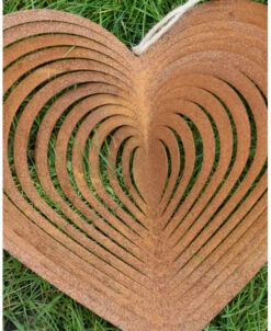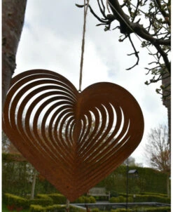 Wind vanger in hart vorm ecoroest. Deze leuke windvanger is in model van een hart, met heel veel spiralen wordt het hart steeds kleiner tot het midden een gevuld hart is. Het hart komt plat mee en kan heel gemakkelijk in een mooie draai worden gebogen zodat de wind met het hart kan spelen. Aan de bovenzijde van het hart zit een gaatje waar u een touwtje of een ketting aan kunt doen en het zo in de tuin kunt hangen. De wind zal het hart vangen en gezellig ermee draaien.