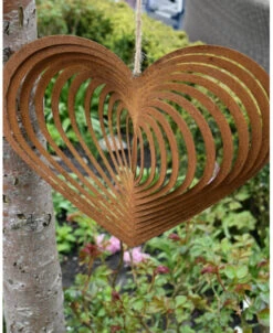 Wind vanger in hart vorm ecoroest. Deze leuke windvanger is in model van een hart, met heel veel spiralen wordt het hart steeds kleiner tot het midden een gevuld hart is. Het hart komt plat mee en kan heel gemakkelijk in een mooie draai worden gebogen zodat de wind met het hart kan spelen. Aan de bovenzijde van het hart zit een gaatje waar u een touwtje of een ketting aan kunt doen en het zo in de tuin kunt hangen. De wind zal het hart vangen en gezellig ermee draaien.