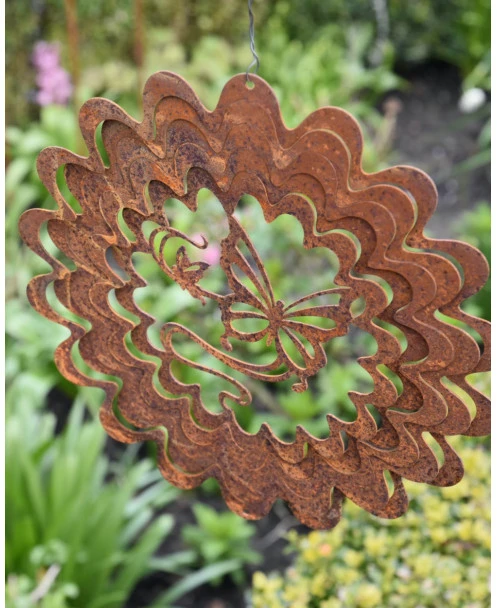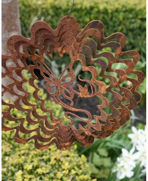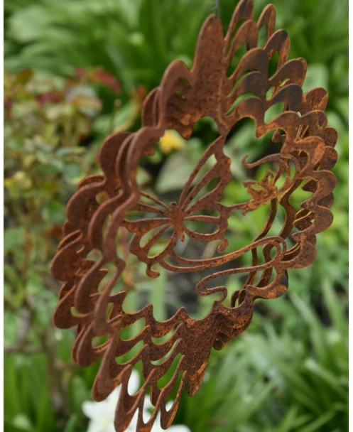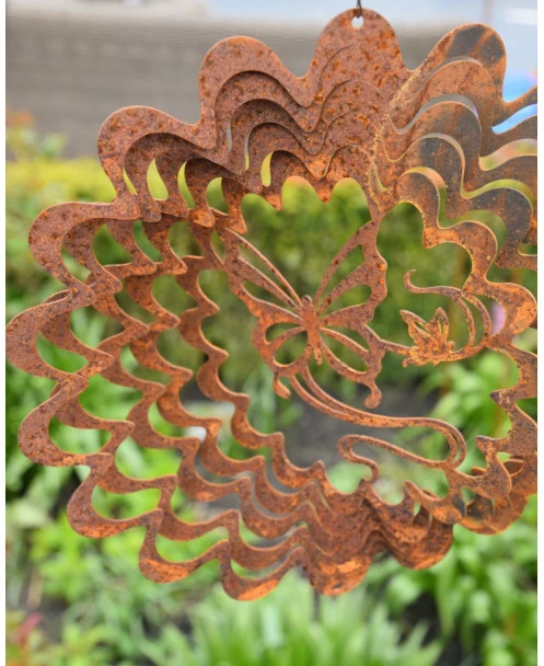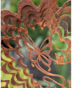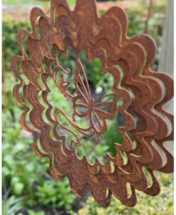 Wind vanger Vlinder in bloem ecoroest. Deze leuke silhouet windvanger van ecoroest heeft in het midden een vlinder met eromheen een steeds groter wordende bloem die als een spiraal rond de vlinder zit. De boven en onderzijde heeft een gaatje waar u een touwtje of ketting aan kunt hangen zodat hij in de tuin met de wind kan spelen. Door de wind zal de windvanger gaan draaien en het geheel siert uw tuin op. De windvanger wordt plat geleverd, het is heel makkelijk om de spiralen in een mooie positie te buigen om zo de wind z’n werk te kunnen laten doen.