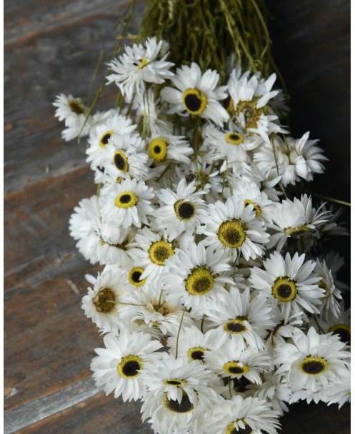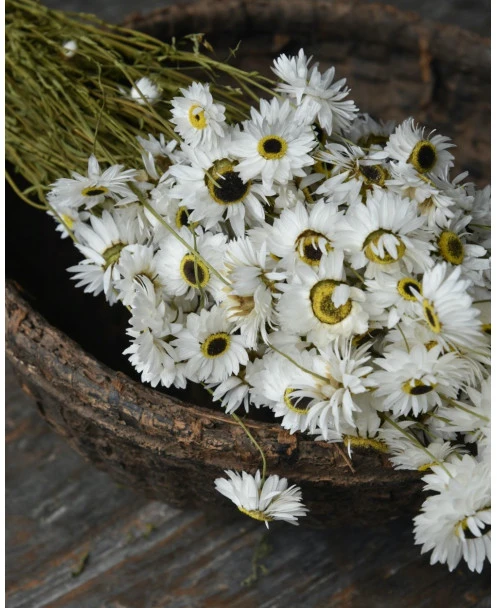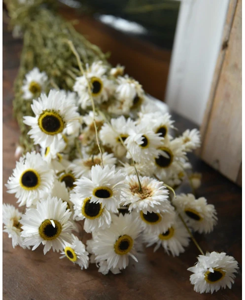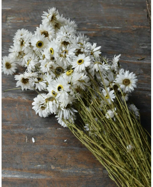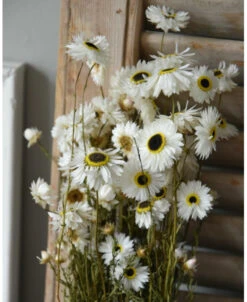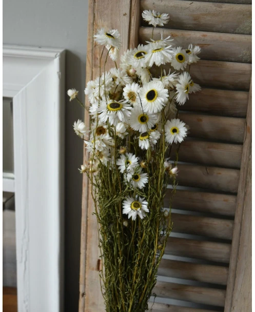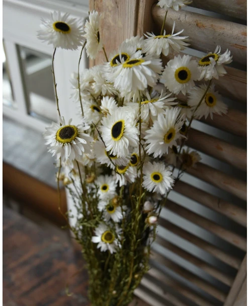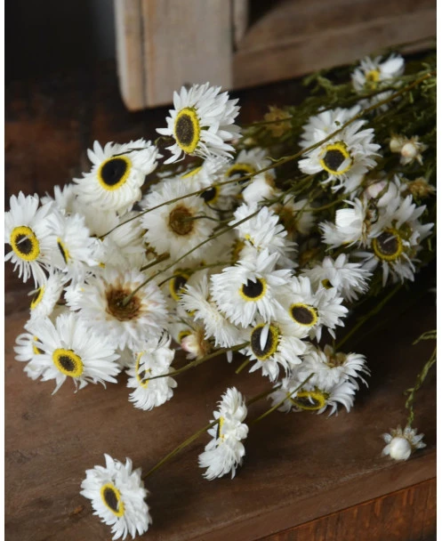 Wit gedroogde Acroclinium met zwart hart. Deze leuke bloemetjes hebben de vorm van madeliefjes, ze zijn echter iets groter van bloem en hebben een geel met zwart hartje. De bloemen zijn gedroogd en kunnen zowel goed gemengd worden met andere droogbloemen als solide in een vaas.