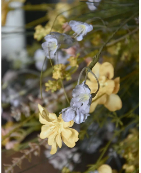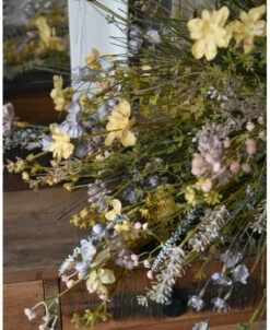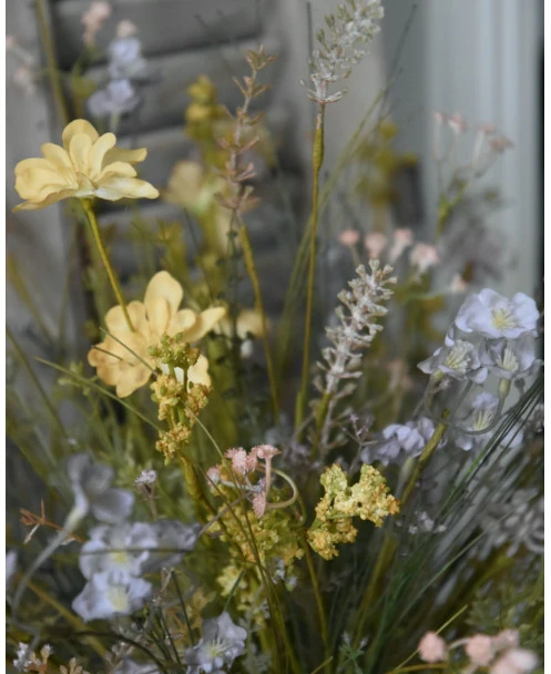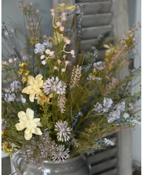 Zacht vrolijk pastel gemengd veldboeket zijde/kunst, IB Laursen. Dit gezellige boeket in de mooiste pastel tinten is met fijne bloemen en groenen als veldboeket samengesteld. Het zijde/kunst boeket heeft zachte tinten geel, blauw, roze, groen, paars, lila en violet, die samen dit prachtige boeket creëren. U kunt het boeket zo op een mooie pot of vaas zetten en genieten. Alle bloementakken zijn van het Deense merk IB Laursen.