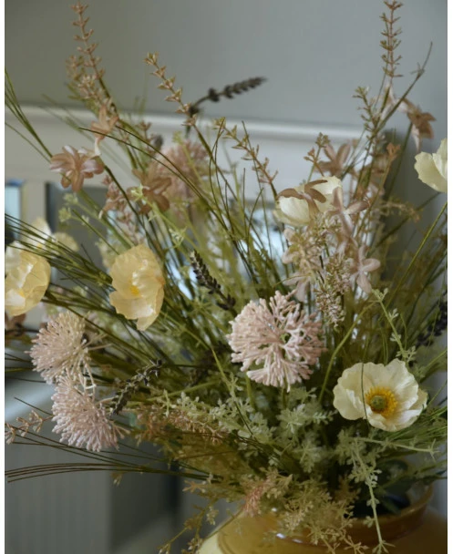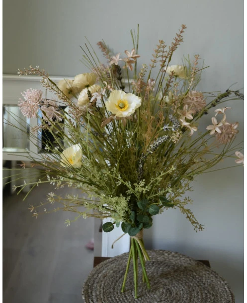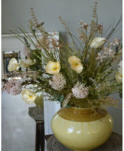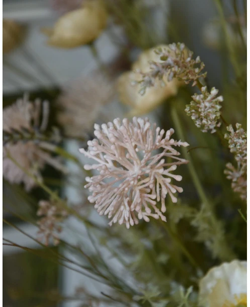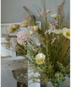 Zijde boeket in poeder tinten met Lavendel, Anemonen en Allium. Dit prachtige boeket van zijde/kunst bloemen uit de collectie van IB Laursen is gemaakt met bloemen in zachte poedertinten. In het boeket zit o.a. Lavendel, Anemonen, Allium, bloem aren en verschillende soorten groen. U kunt het boeket zo op een mooie vaas of pot zetten en eventueel nog naar wens wat bloemen in de juiste positie buigen. Het boeket is met touw gebonden.